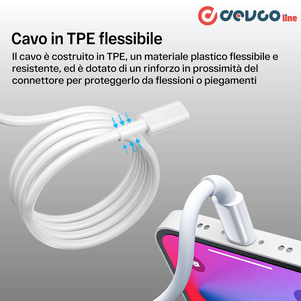 Il cavo USB-C - Lightning, è compatibile con qualsisi dispositivo fornito di USB-C e uscite per iPhone, iPad, AirPods e iWatch, in quanto grazie al connettore USB-C possono essere collegati all’alimentatore 20W rendendo possibile la funzione di ricarica rapida
